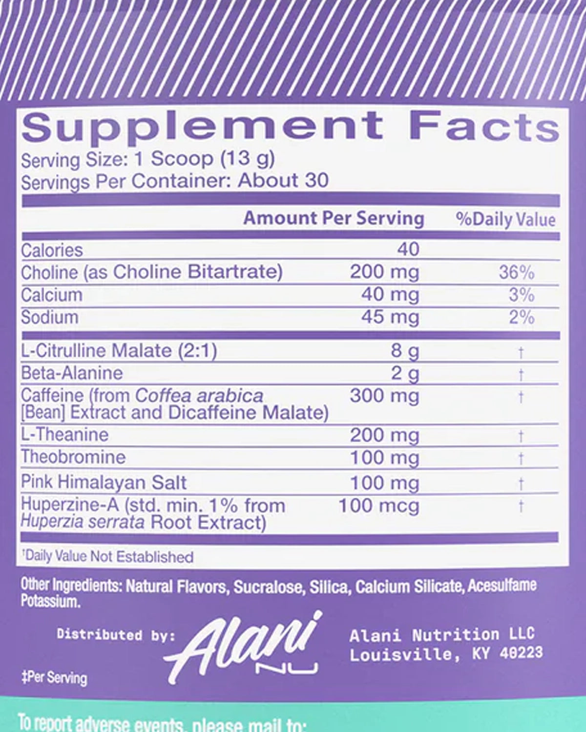 Alani Nu Pre-Workout: Here for your taste buds—Alani Nu was founded in 2018 by entrepreneur and influencer Katy Hearn. It is a health and wellness brand focused on providing low-calorie products with unique flavors. Check out everything from Alani Nu and follow us through our brand store to stay updated on all things Alani! Note: This product is not recommended for children, people sensitive to caffeine, pregnant women, or nursing mothers.