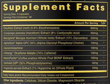 MORE BENEFITS - Other key ingredients include Huperzine A, Glucoronolactone, Infinergy, Cordyceps Mushroom, and Eleutheroside. These benefits build on reducing elevated cortisol levels and stress and fatigue while increasing coordination, balance, and equilibrium, to name a few.