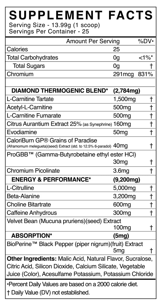 Purpose: Cuts Diamond is our strongest thermogenic pre-workout. Burn more fat than ever before while increasing pump, energy, performance, and focus. Time, heat, and pressure create diamonds.