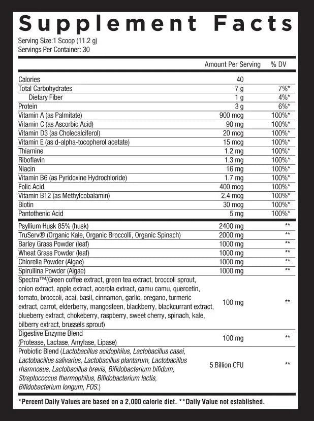 The heart of our GREENS formula is our plant blend, constituted by: Psyllium husk, TruServĀ® (organic kale, broccoli, and spinach), barley grass, wheat grass, chlorella, spirulina and Spectraā¢. Our 11+ gram scoop provides the function equivalent of several pounds of these greens. Additionally, one scoop serving delivers you 100% of the daily value of 13 vitamins and a range of antioxidants and bioactives. To complement the greens themselves, we have added TruServĀ® and Spectraā¢, two industry-leading plant and vegetable/fruit blends. And lastly, to ensure that GREENS does not cause the bloating and gas associated with many greens products, we have included not only probiotics, but a full-spectrum digestive enzyme blend. Were that not enough, the product tastes fantastic!