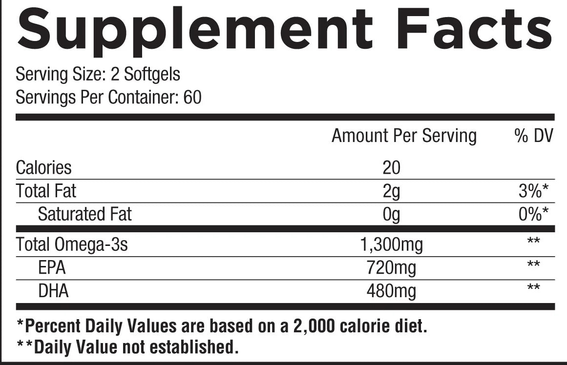 2 soft gels per serving. 60 servings per container. Supports heart and brain health.