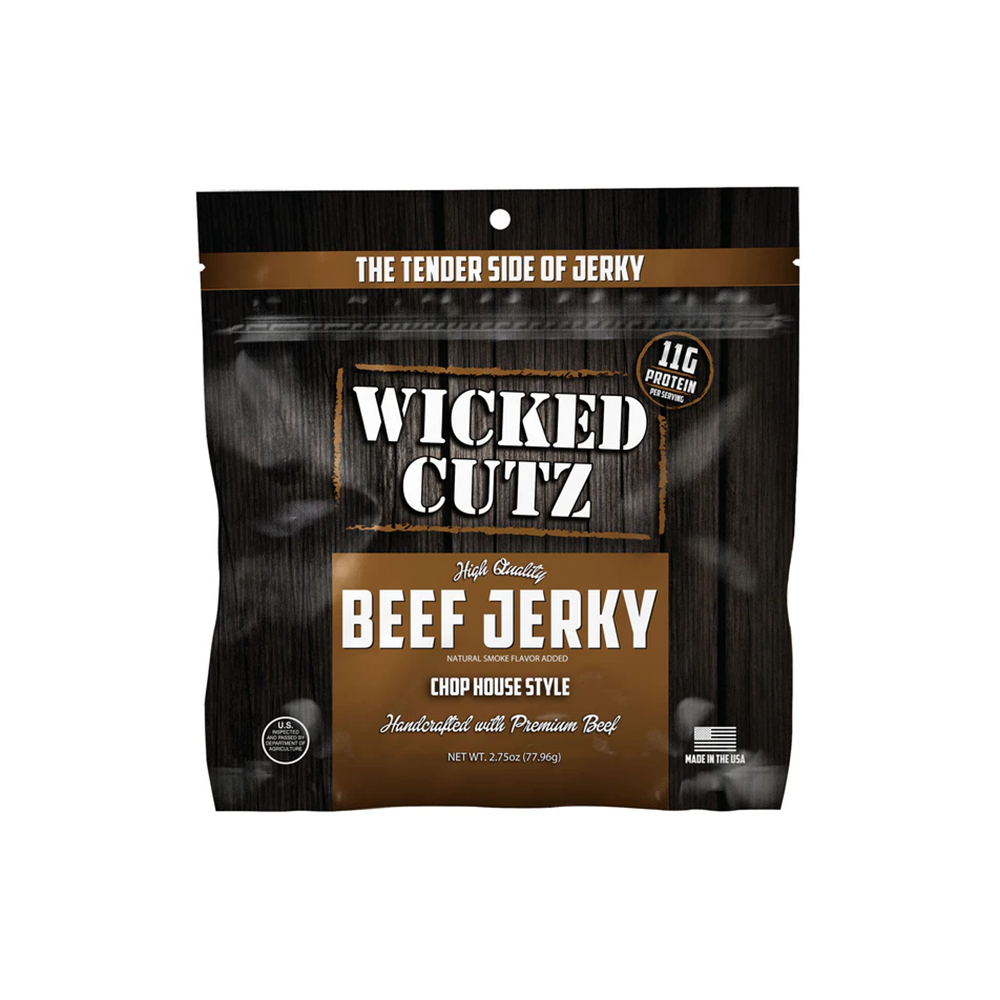 5 BAGS OF PREMIUM BEEF JERKY with tender, flavorful high-quality beef. (1) Original Peppered, 36g Protein Per Bag, (1) Volcanic Jalapeno, 27g Protein, (1) Chop Classic, 21g Protein, (1) Orange Teriyaki, 24g Protein, (1) BBQ Mesquite Jerky, 21g Protein per Bag, 2.75oz Each