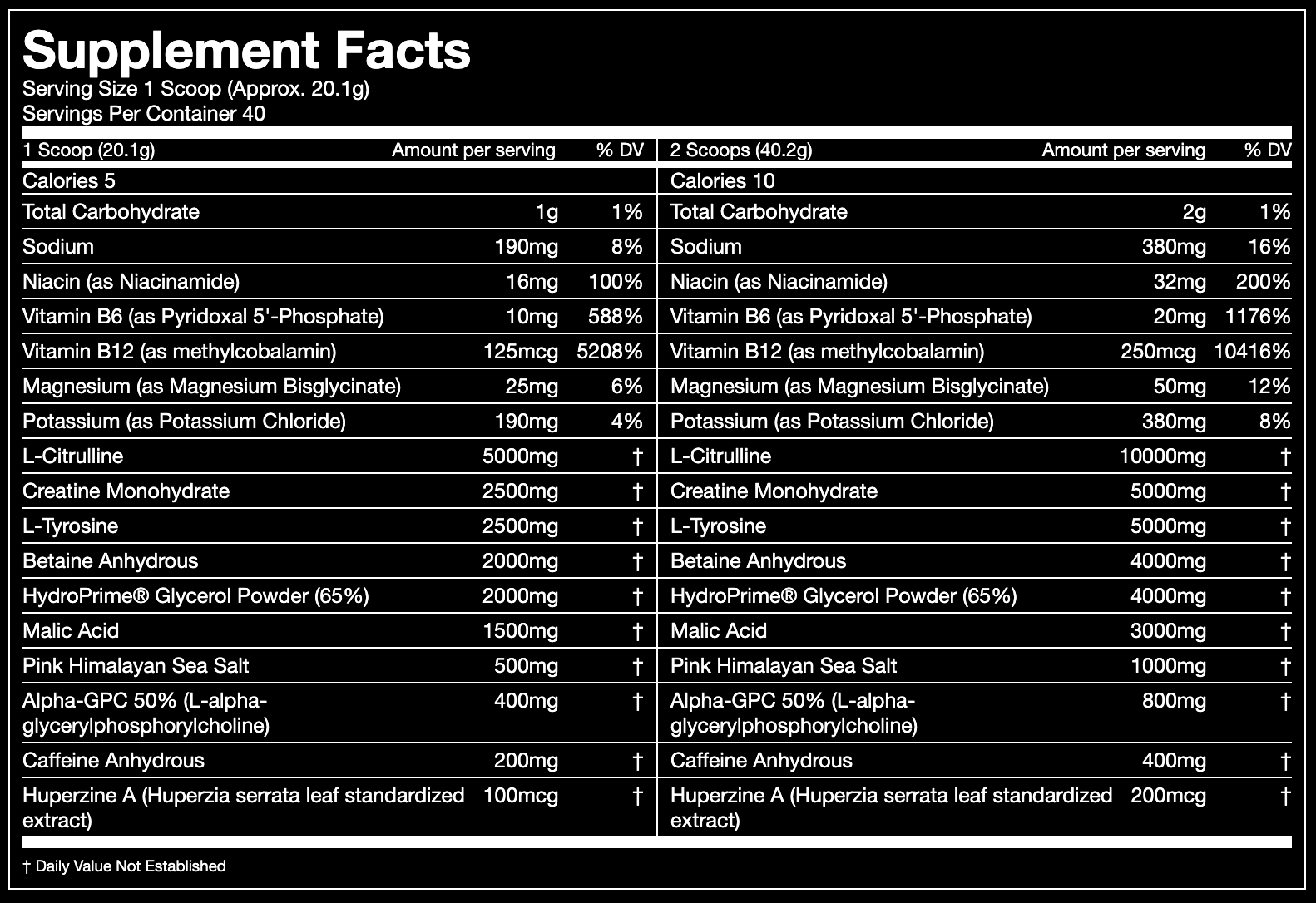 5,000 mg Creatine Monohydrate, 4,000 mg Betaine, 4,000 mg HydroPrime, 1,000 mg Pink Himalayan Sea Salt - Supersaturates the muscle with blood and induces a state of hyper-hydration for massive pumps, endurance, and power. Includes your daily saturation dose of creatine and a backload of sodium as a safeguard for hydration. Creatine has been shown to significantly improve strength, power output, and muscle size. Sodium complements creatine by enhancing its uptake into muscles, supporting ATP production.