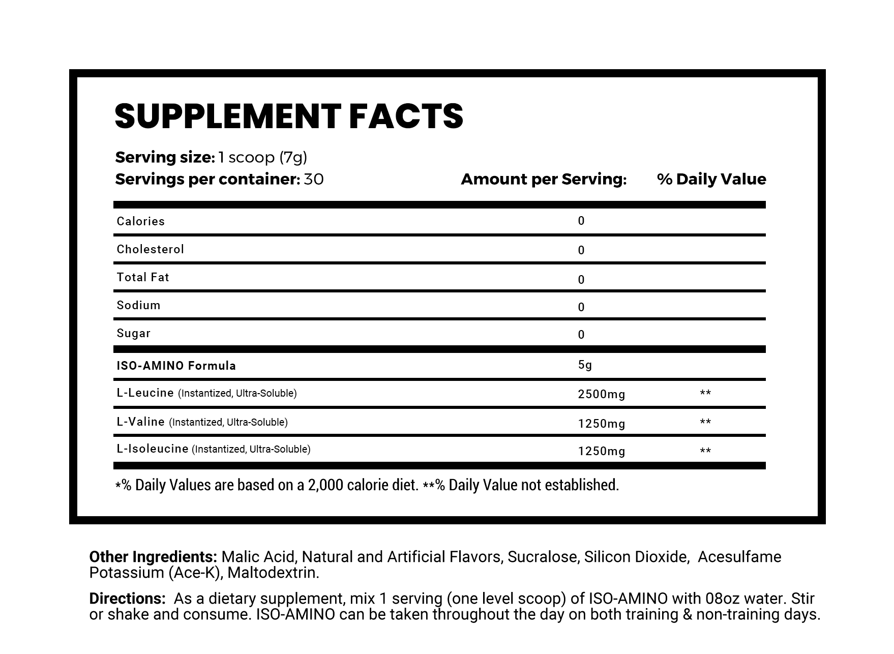 Pure Isolated BCAA. Research-validated 2:1:1 BCAA ratio. Burn fat and preserve lean muscle tissue. Accelerate exercise endurance and recovery. Mixes easily, tastes incredible. Iso-Amino packs 5 grams of pure isolated BCAAs per serving in a scientifically proven 2:1:1 ratio. No fluff, no fillers, and no added colors or dyes. BCAAs are everything you need to rebuild, repair, and trigger lean muscle growth. Iso-Amino can be taken throughout the day and is especially useful intra-workout to speed recovery. We take flavor and mixability very seriously. This is where Iso-Amino stands as the clear leader. The ultra-unique flavors and easy-to-mix powder set the standard for high-quality BCAAs. Fuel your athletic performance with Iso-Amino.
