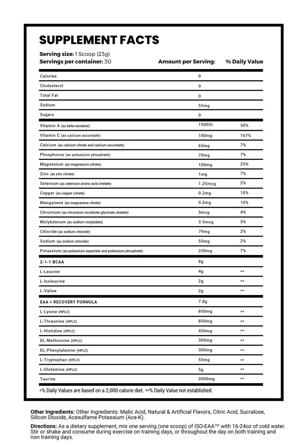 EAAs or Essential Amino Acids are aminos that can’t be produced by your body and must be obtained through diet or supplementation. These aminos (that also include BCAAs) play a vital role in exercise performance, especially preventing muscle breakdown.