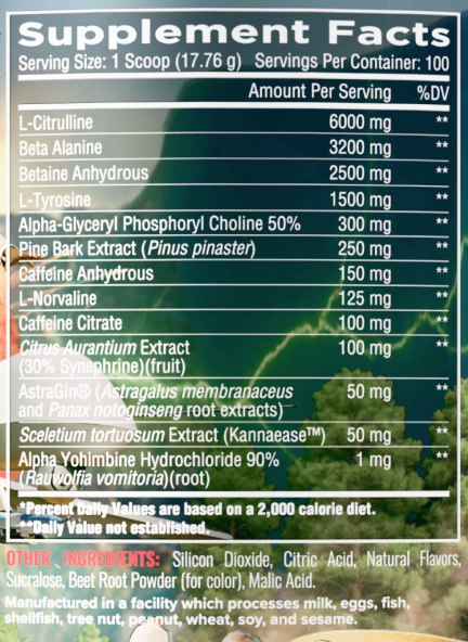 1776, a year that will live in infamy as the birth of this great nation. How do we honor such an event you may ask. Well, in true Merican fashion, we created the most unapologetically Merican pre-workout ever created — a 100-serving powerhouse built on a fully loaded 17.76-gram scoop that delivers intense pumps, high voltage energy, and thunderous intensity worthy of the legends printed on its label. With 6 grams of Citrulline, 3.2 grams of Beta Alanine, 2.5 grams of Betaine, and a full supporting cabinet of performance-boosting ingredients like Tyrosine, Alpha-GPC, Pine Bark, AstraGin®, Kannaease™, and L-Norvaline, this formula unleashes explosive strength, tunnel-vision focus, and sleeve-splitting blood flow. Add in a dual-phase caffeine system, hard-hitting synephrine, and a precise 1 mg of Alpha Yo, and you get energy that hits fast, stays clean, and drives you through even the most brutal training sessions.