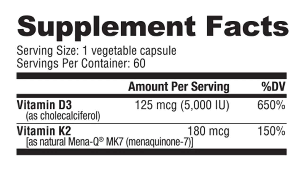NutraBio Vitamin D3 + K2 is a powerful combination that delivers 5,000 IU of Vitamin D3 and 180 mcg of Vitamin K2 per serving, designed to support bone health, cardiovascular function, and immune system strength. Vitamin D3, known as the "sunshine vitamin," plays a crucial role in helping the body absorb calcium, essential for maintaining strong bones and teeth. However, without Vitamin K2, calcium may not be directed to the bones efficiently and could accumulate in the arteries instead.