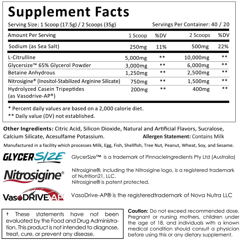 "Pump" is naturally occurring during resistance training when blood and other fluids are pushed to muscle cells, expanding them. Using ingredients to increase a pump can be a very beneficial way to increase hypertrophy and grow muscle size. define[pump] increases pump by providing L-Citrulline and Nitrosigine which increase nitric oxide production, allowing for greater vasodilation and bloodflow; Vasodrive-AP which inhibits vasoconstriction; and Glycersize, Betaine, and Sodium which increase intra-cellular hydration (pulling fluid to muscle cells). define[pump] uses above efficacious doses of all these ingredients at one scoop and the most effective doses at two scoops. These qualities make define[pump] the most ideal supplement to take before a workout for a pump.