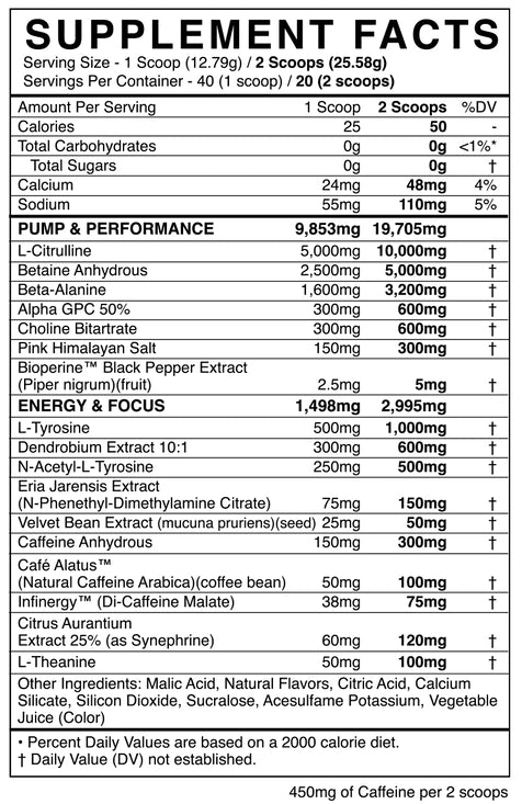 Featured Ingredient: L-Citrulline, Betaine Anhydrous, Beta-Alanine, Dendrobium Extract, Eria Jarensis, Citrus Aurantium, Velvet Bean Extract, 450mg Caffeine.