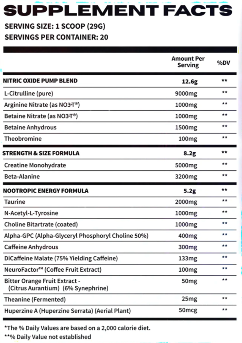 Nootropic energy sourced from a choline-cocktail derived from A-GPC + choline bitartrate (coated). The mind-to-muscle connection is on point. You can feel every rep from your first to your absolute last.