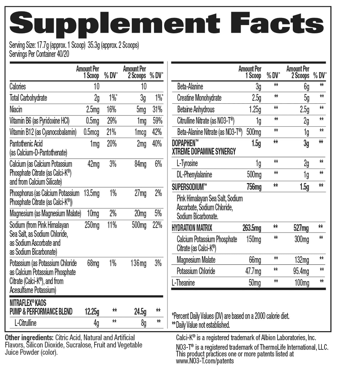 Combining the endurance-boosting benefits of Beta-Alanine with the vasodilation effects of Nitrate in NITRAFLEX KAOS Stim-Free, this powerful patented ingredient synergistically enhances athletic performance and supports peak physical output.