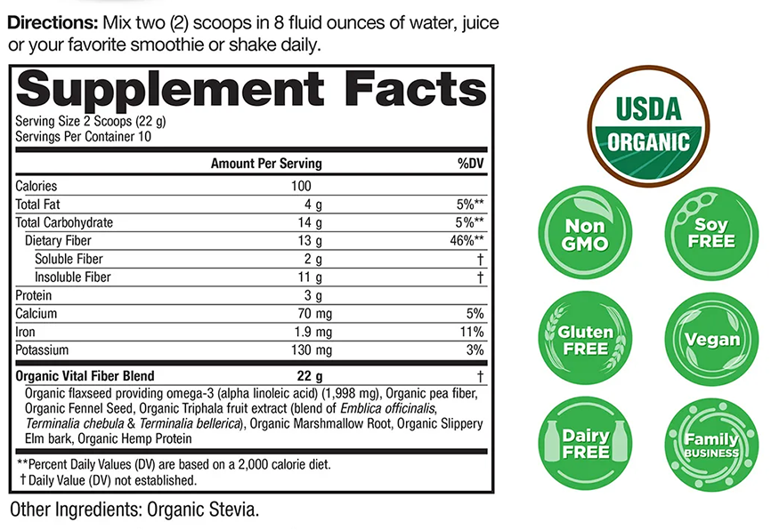 Soluble fiber helps to absorb calories, cholesterol, and waste. Insoluble fiber moves digestion along and adds bulk to stools. Vital Fiber is 85% insoluble fiber derived from Flax, Pea, and Hemp. Other ingredients include Organic Fennel seed, Organic Marshmallow root, Organic Slippery Elm, and Organic Triphala fruit.