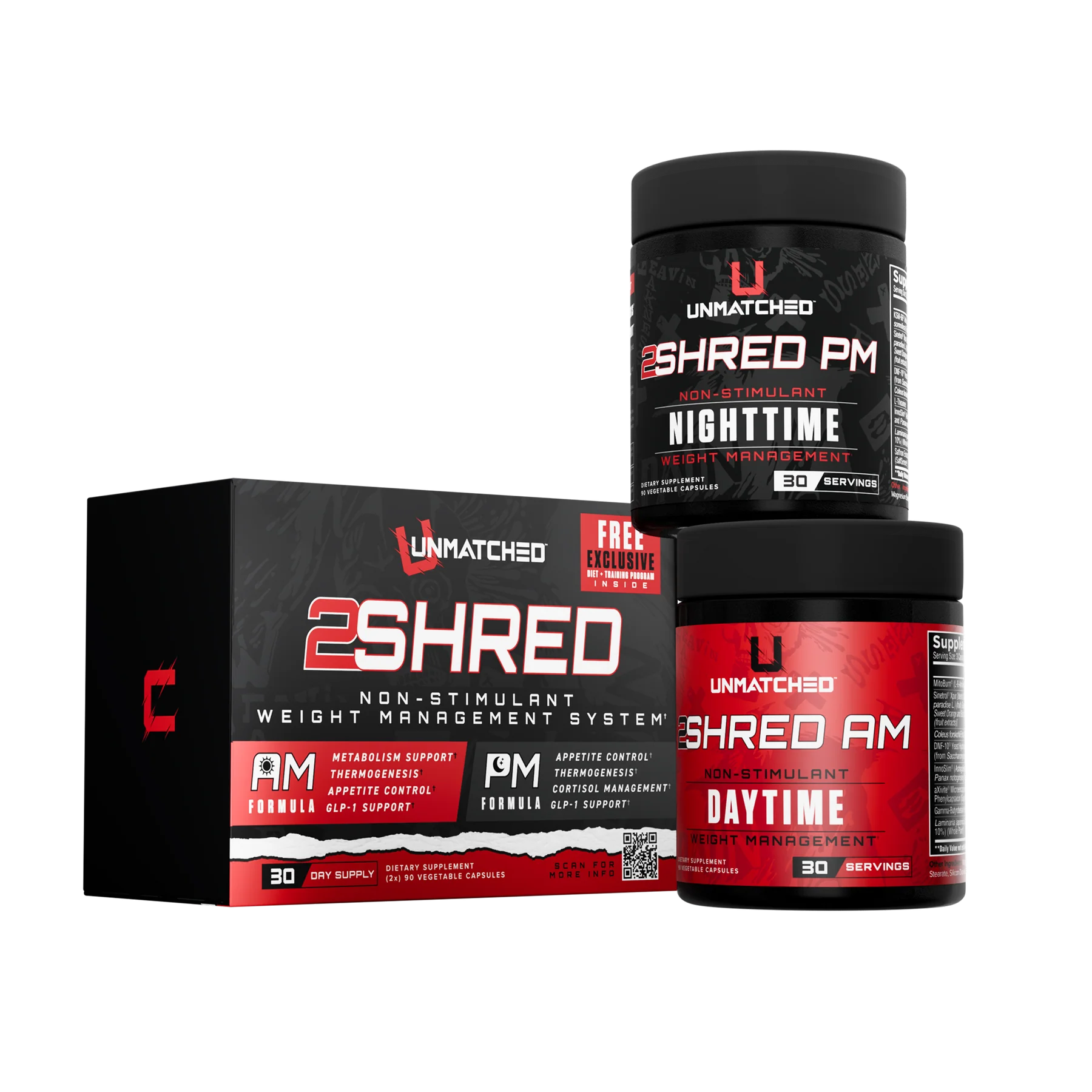 Unmatched 2Shred is a dual-phase fat-burning system designed to optimize weight loss around the clock. The AM Burner jumpstarts your day by activating thermogenesis, boosting your metabolism even at rest, and curbing your appetite to help reduce caloric intake. It also enhances the breakdown of stored fat, setting the tone for efficient energy use throughout the day. As the day winds down, the PM Burner takes over to support nighttime fat burning while you rest. It helps control evening cravings and appetite, ensuring you stay on track with your goals. This formula also promotes hormonal balance and reduces stress, two critical factors that can affect fat storage and weight loss. In addition, it supports a stable mood, helping you stay focused and motivated. Together, these synergistic blends deliver 24-hour metabolic support. Whether you're powering through your day or winding down at night, 2Shred works continuously to help you burn fat and control cravings. It's your all-day, all-night partner in achieving a leaner, healthier body.