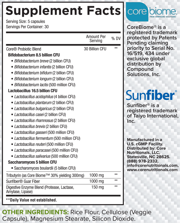 The gut, or gastrointestinal (GI) tract, is one of the largest systems responsible for keeping our body in working order. Food and a wide variety of nutrients pass through the separate parts, being broken down and absorbed only to be shuttled to their final destination to begin to do their job. In addition to this food, countless numbers of microorganisms from the environment pass through the gut ā some of which may be detrimental to health and alter the integrity of the GI tract. Core GUT was formulated to provide all-around GI tract support with beneficial bacteria in a custom probiotic blend, a usable form of food for these microorganisms in a prebiotic, beneficial by-products in a postbiotic, and digestive enzymes to aid in the breakdown of crucial nutrients. This combination of ingredients has been shown to support the growth of healthy gut bacteria, enhance immune function, provide support for gut lining integrity, and display protective effects on the gut environment.