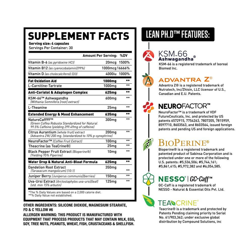 LEAN Ph.D - "The Smart Thermogenic" takes the smart approach to weight-loss by addressing multiple areas of dieting that can drastically impact results: hunger, stress, metabolism, mood, energy, and water weight management.