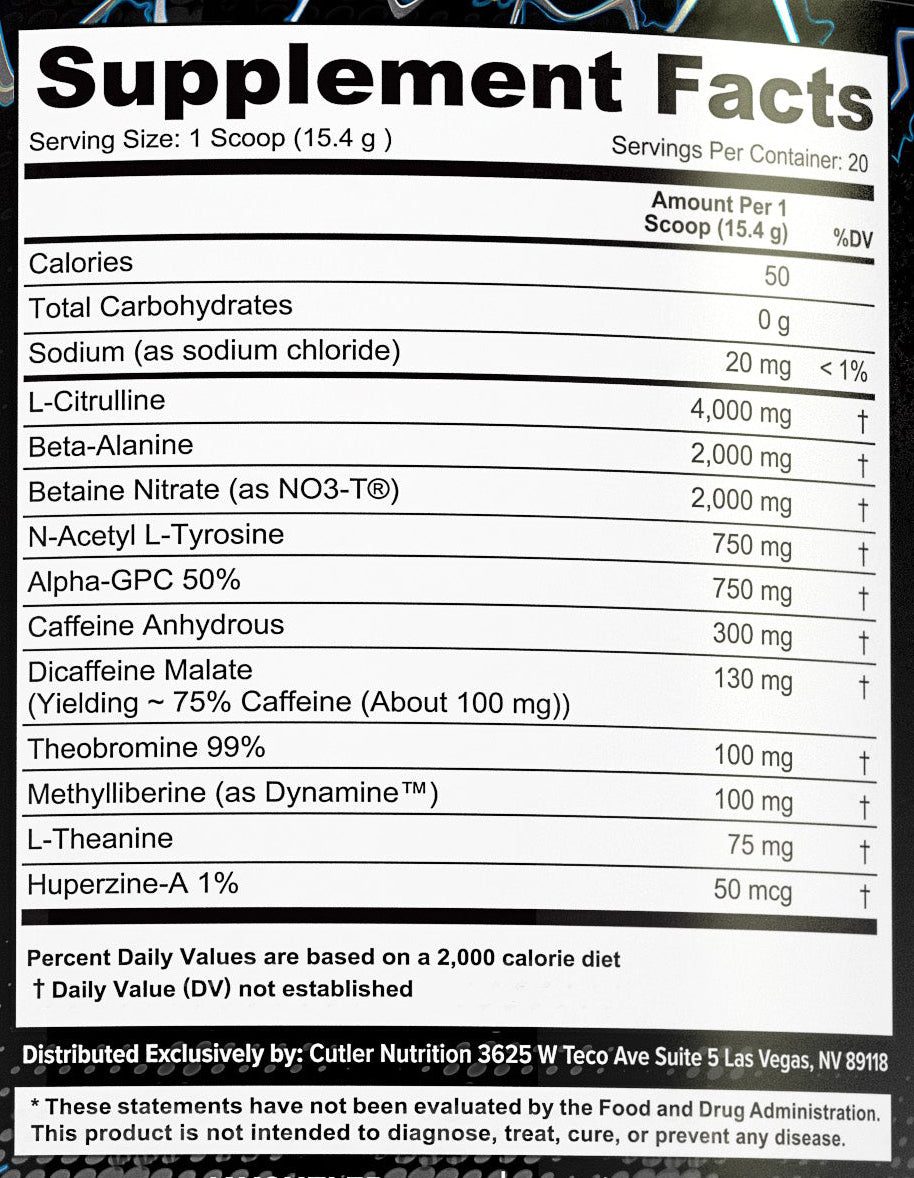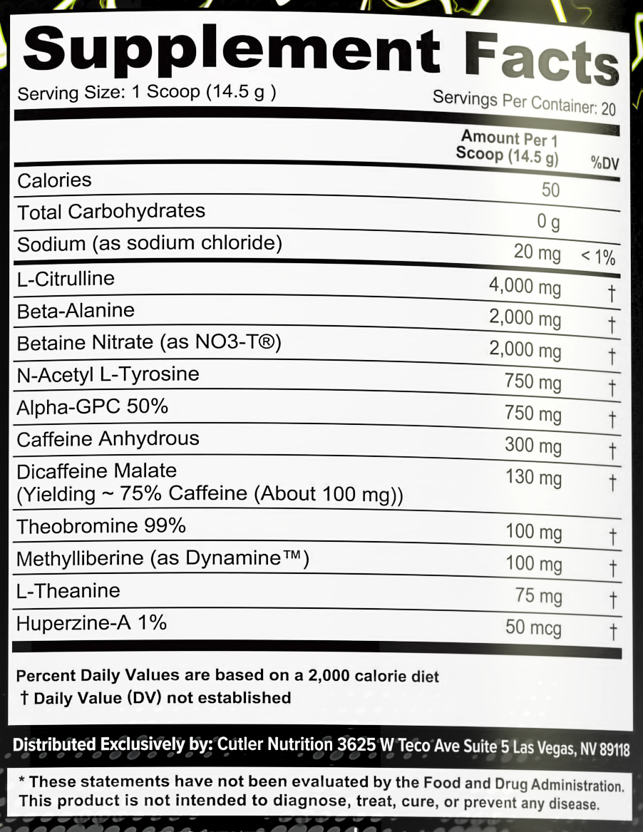 Tunnel Vision Focus: Ditch your boring nitric oxide powder for our cutting-edge nootropic pre-workout formula with patented Dynamine and NO3-T Betaine, combined with L-theanine, Alpha GPC, and Huperzine A.